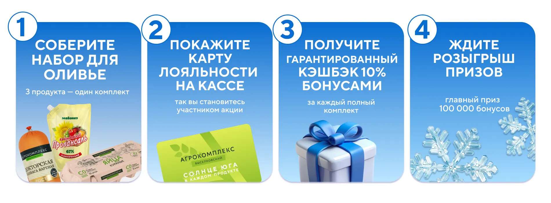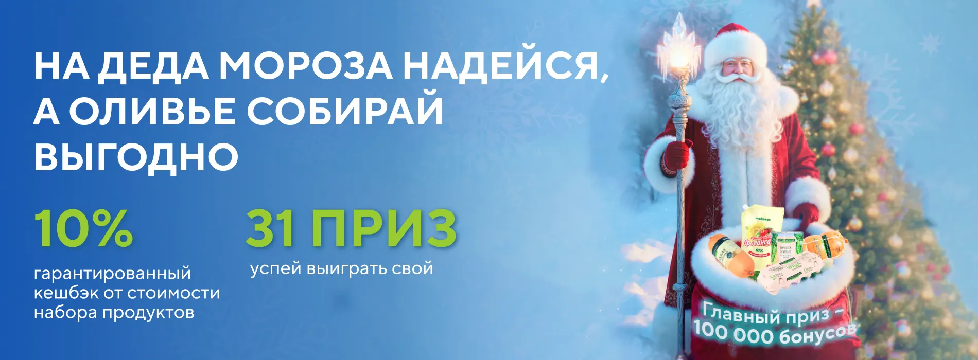 Приходите к нам за покупками, приобретайте три необходимых ингредиента для оливье, предъявляйте вашу карту лояльности на кассе – и готово!